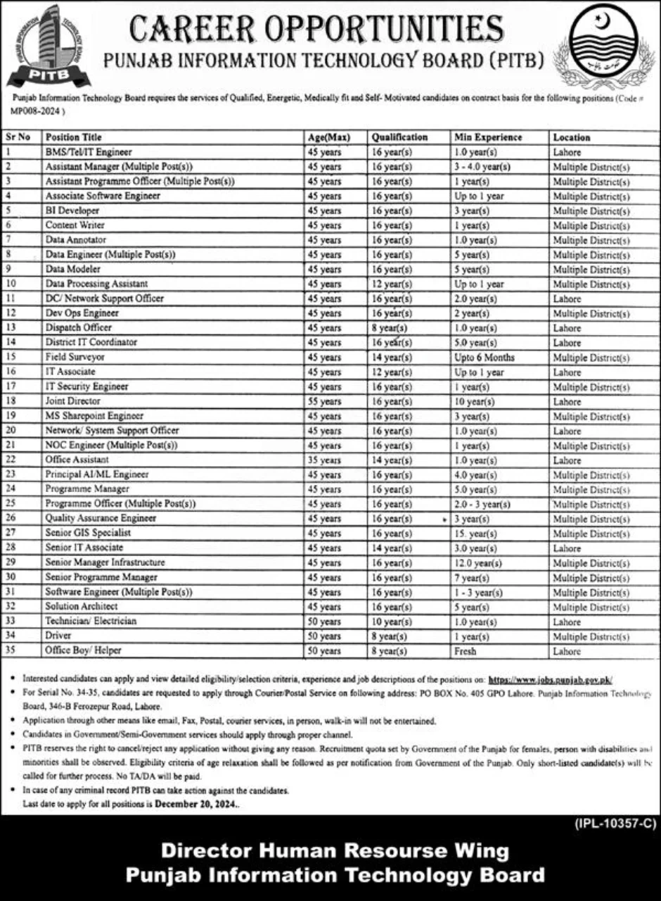 Job Overview The Punjab Information Technology Board (PITB) has announced job openings for 25 vacancies in various positions across IT, engineering, administration, and content creation. These positions offer excellent career opportunities to skilled professionals interested in contributing to the digital transformation and innovative solutions in governance in Punjab. Job Details Posted On December 1, 2024 … Read more