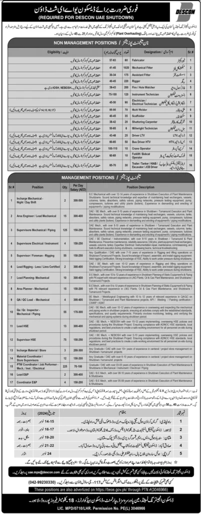Descon Engineering Limited, a leading multinational engineering company, is hiring 2756 skilled and supervisory professionals for its UAE Shutdown Project. This is an excellent opportunity for candidates with relevant experience in plant maintenance, rigging, piping, HSE, instrumentation, and equipment operation.