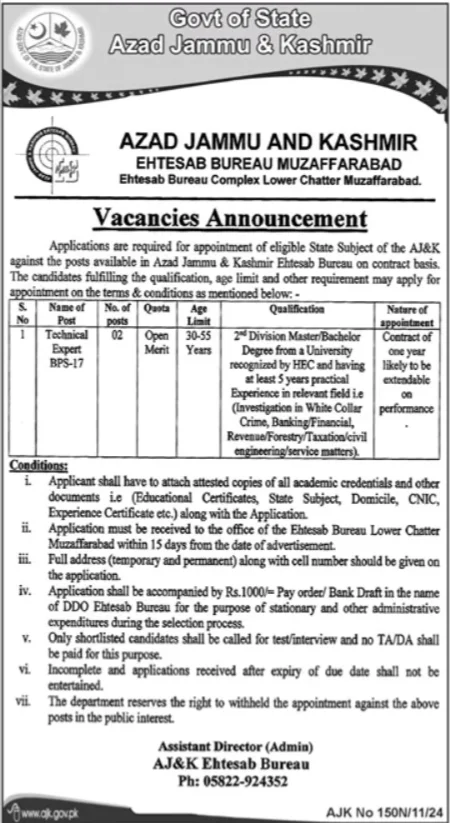 The Ehtesab Bureau Muzaffarabad has announced exciting job opportunities for Technical Experts (BPS-17) on a contract basis. This is a great opportunity for individuals skilled in investigations, finance, taxation, and engineering to contribute to a key government organization in Azad Jammu and Kashmir (AJK).