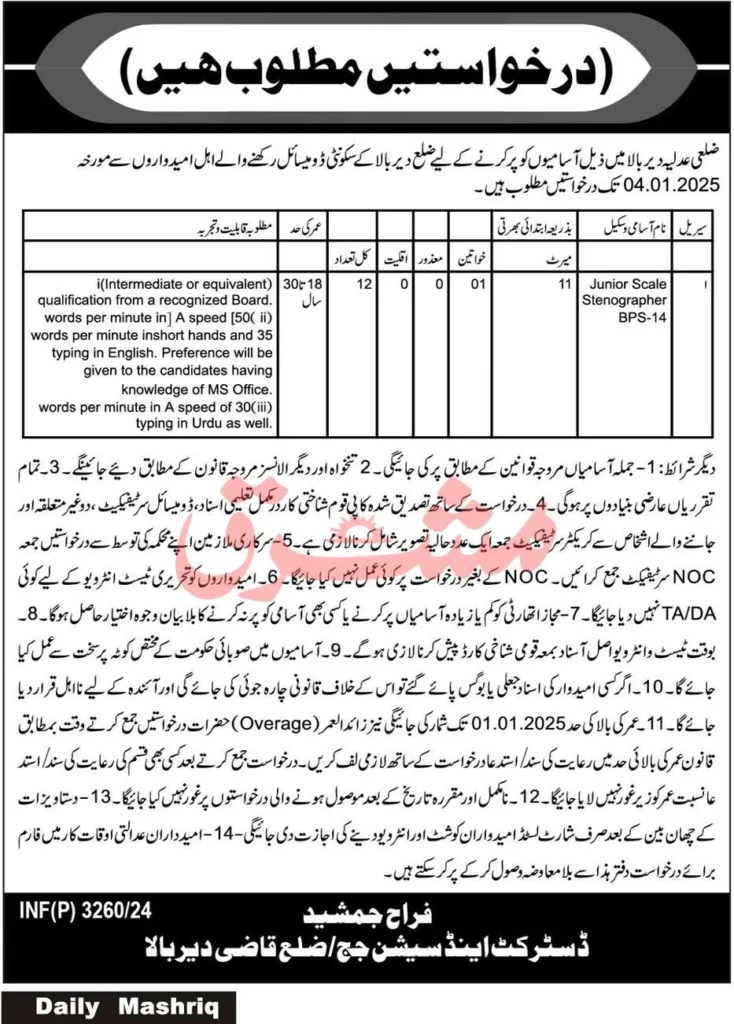 The District & Sessions Court Mardan is inviting applications for the position of Junior Scale Stenographer (BPS-14). This is a great opportunity for candidates with proficiency in typing and shorthand.