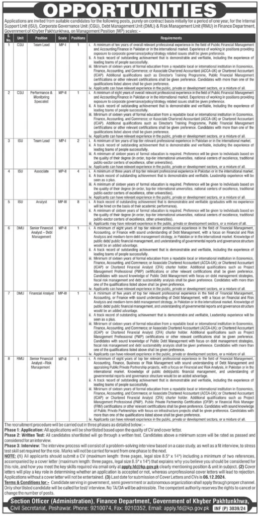 The Finance Department, Government of Khyber Pakhtunkhwa (KPK), has announced exciting job opportunities for 2024. Applications are invited for 19 positions across various roles such as Senior Financial Analysts, Team Leads, and Associates. These positions are contract-based, offering competitive MP scales for qualified candidates in finance, economics, and management fields.