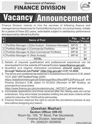 The Federal Finance Division is offering exciting job opportunities for highly skilled and motivated professionals to join the Central Monitoring Unit in Islamabad. This department is seeking individuals with expertise in portfolio management, financial oversight, data analysis, and risk management. If you have a background in finance or related fields, this is your chance to contribute to Pakistan’s economic governance and financial management.