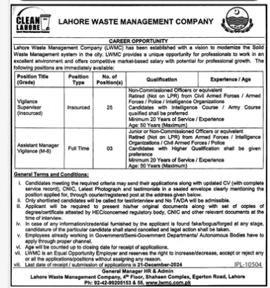 The Lahore Waste Management Company (LWMC) is offering exciting government job opportunities in Lahore. The available positions include Assistant Manager Vigilance, Vigilance Supervisor, and Quality Assurance Engineer. Candidates with the required qualifications and experience are encouraged to apply by the 21st of December, 2024.