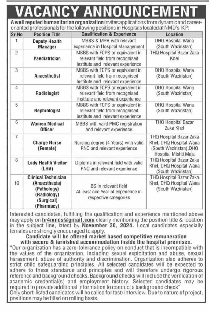 | Deputy Health Manager | 2 | MBBS with MPH, hospital management experience | DHQ Hospital Wana (South Waziristan) |
