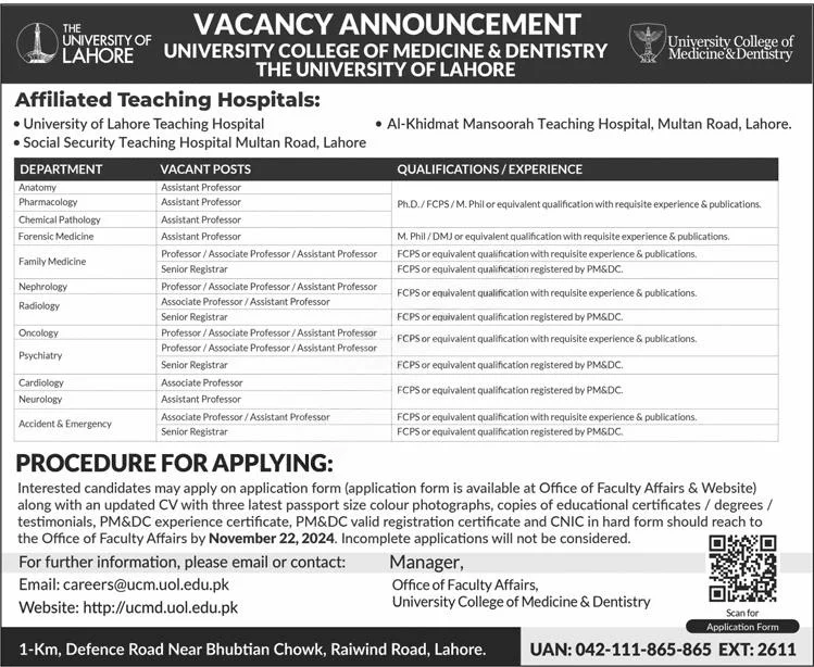 The University College of Medicine & Dentistry (UCMD), a part of the prestigious University of Lahore (UOL), is now offering excellent opportunities for qualified professionals to join as faculty members. Located in Lahore, UCMD is affiliated with renowned teaching hospitals like UOL Teaching Hospital and Al-Khidmat Mansoorah Teaching Hospital. This is a fantastic opportunity to work at one of Pakistan’s leading medical and academic institutions.