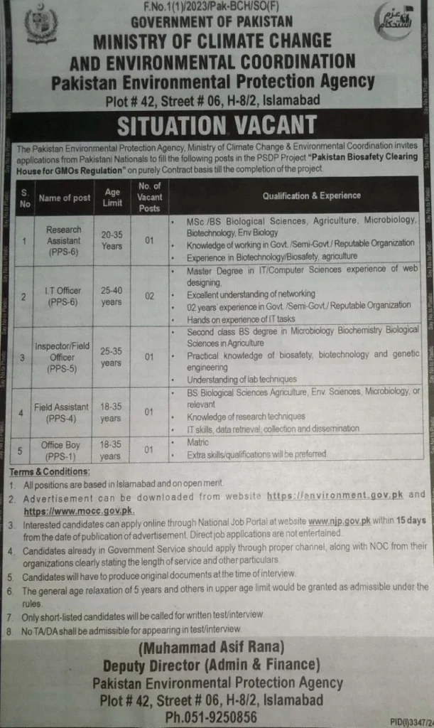 The Ministry of Climate Change and Environmental Coordination (MOCC) invites applications for multiple positions under the PSDP Project titled “Pakistan Biosafety Clearing House for GMOs Regulation.” These contract-based vacancies, including Office Boy, Research Assistant, IT Officer, Field Assistant, and Inspector, are located in Islamabad.