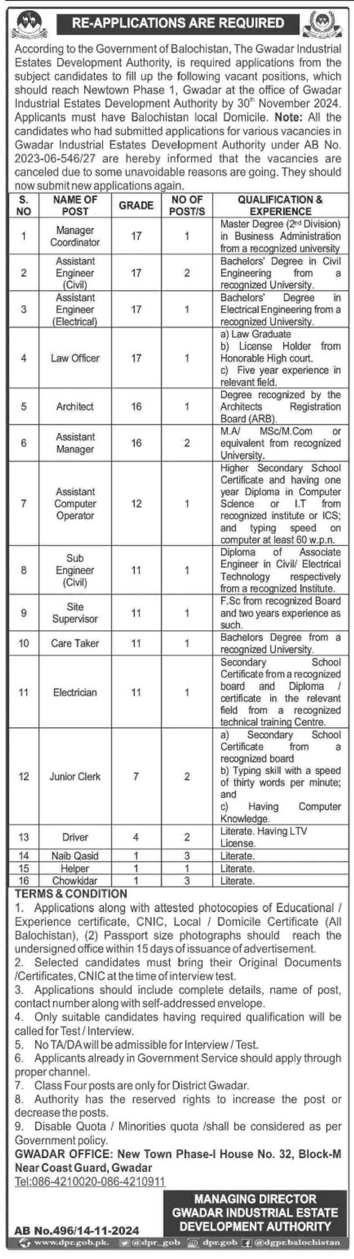 The Gwadar Industrial Estates Development Authority (GIEDA) has announced multiple job openings for 2024, offering 24 vacancies for positions such as Assistant Engineers, Junior Clerks, Managers, and other roles. This is an excellent opportunity for candidates residing in Balochistan with qualifications ranging from literate to Master’s level. Applicants must possess a valid Balochistan domicile to … Read more