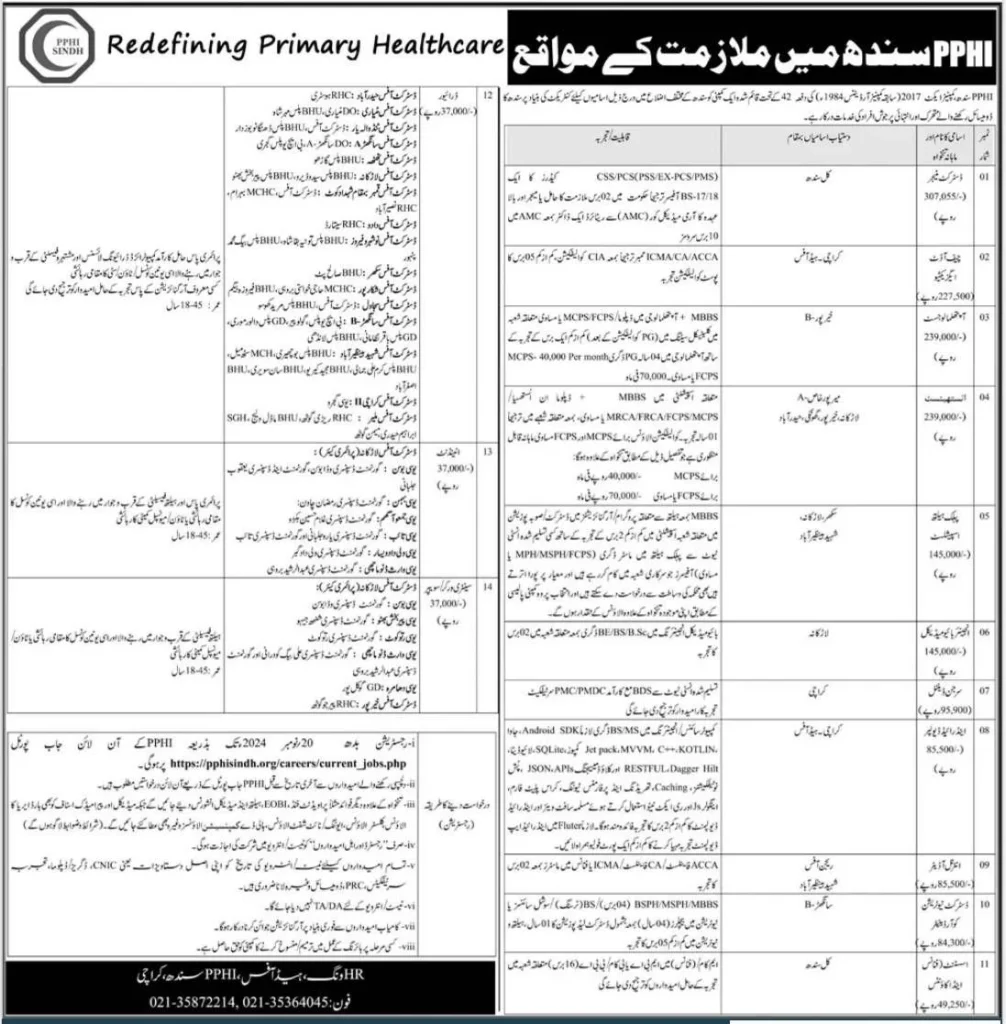 PPHI Sindh is seeking qualified professionals for various healthcare positions across Sindh. The organization aims to improve primary healthcare services and is hiring dedicated individuals for roles in medical, administration, IT, and finance sectors.