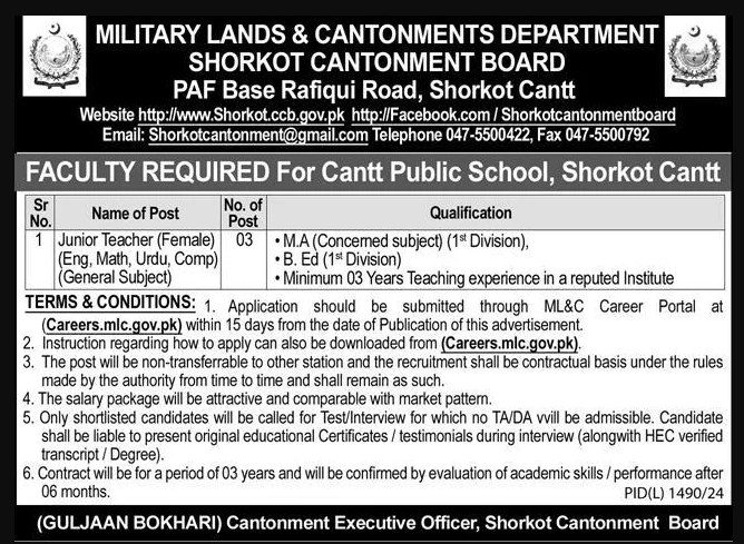 The Military Lands and Cantonments Department invites applications for 3 Junior Teacher (Female) positions at Cantt Public School, Shorkot Cantt. These positions offer an excellent opportunity for qualified educators to contribute to the development of students and work in a reputed educational environment.