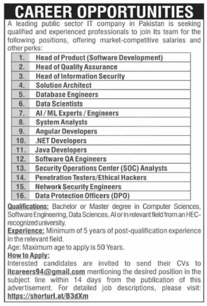 A reputable Public Sector IT Organization in Islamabad invites applications for multiple positions in software development, data science, cybersecurity, and system analysis. These roles are ideal for candidates with expertise in cutting-edge IT technologies, offering opportunities to contribute to the advancement of Pakistan’s digital landscape.