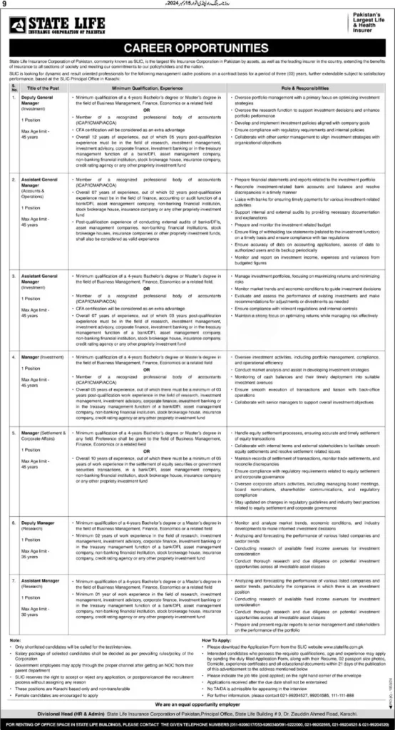 State Life Insurance Corporation, Pakistan’s largest and most trusted life insurance provider, is offering multiple managerial and research positions in investment, research, accounts, and corporate affairs. These positions provide excellent professional growth opportunities within a stable and supportive environment.